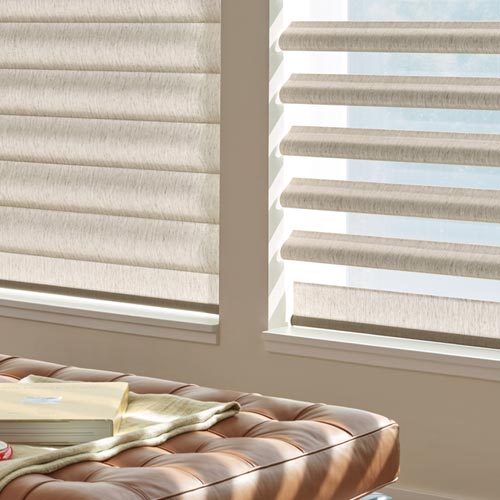 The best part of Hunter Douglas sheer shades is the versatile positioning you can experience from the mix of sheers and solid vaning. With Pirouette® Shades, the front solid vanes can close up to control the light and privacy. In this closed position, the shades can roll up into the headrail, pausing along the way for partial coverage. In the fully lowered position, the vanes will fold in place, revealing the sheer fabric back panel, allowing soft filtered light to fill the space without glare. The newest innovation is a dual shade feature, known as A Deux™. A secondary blackout roller shade is incorporated into the headrail, operating independently of the Pirouette® shade, lowering into place when room darkening and light blocking is necessary.